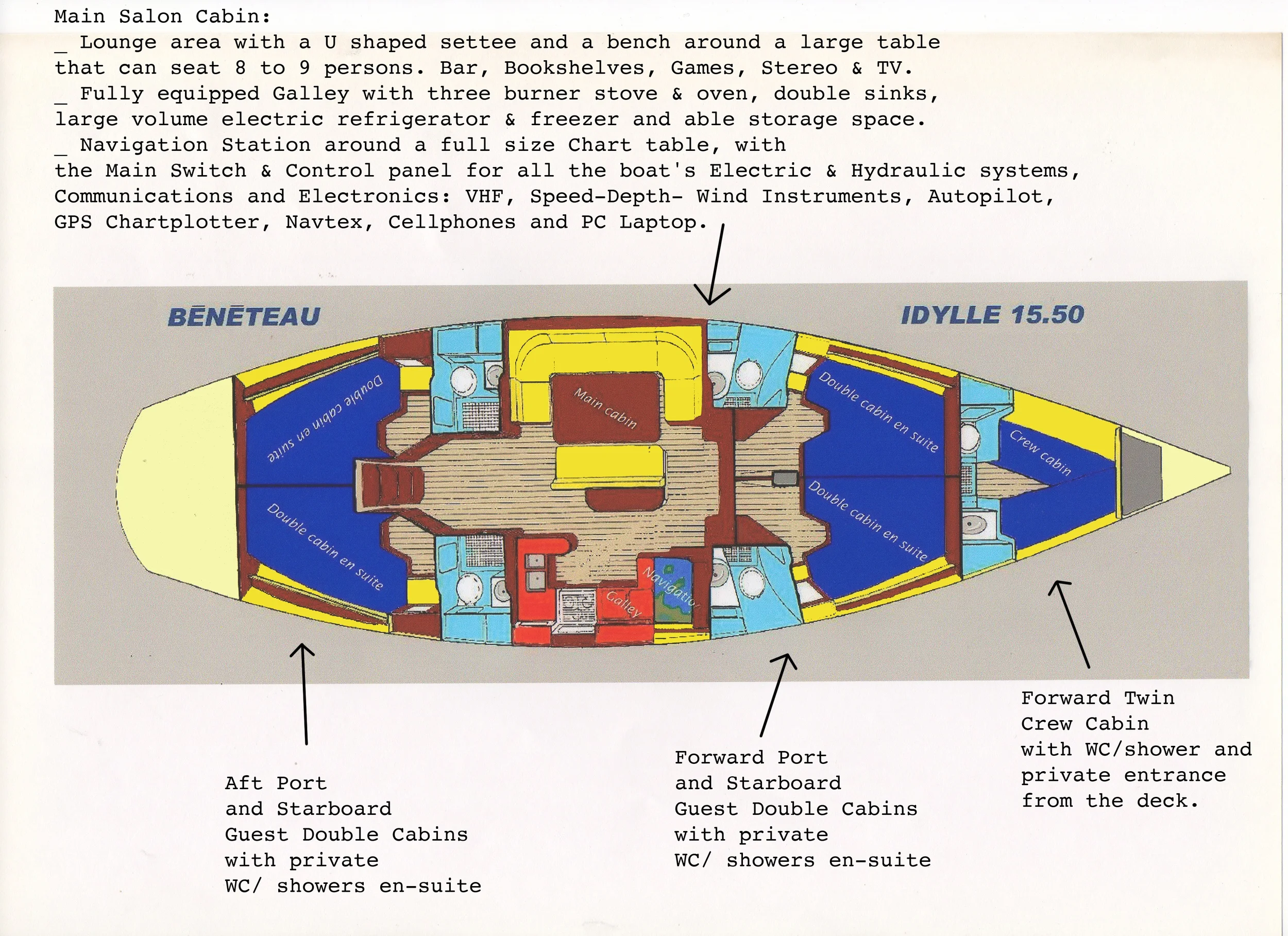 The crew cabin and WC/shower are forward with a private entrance from the deck.
